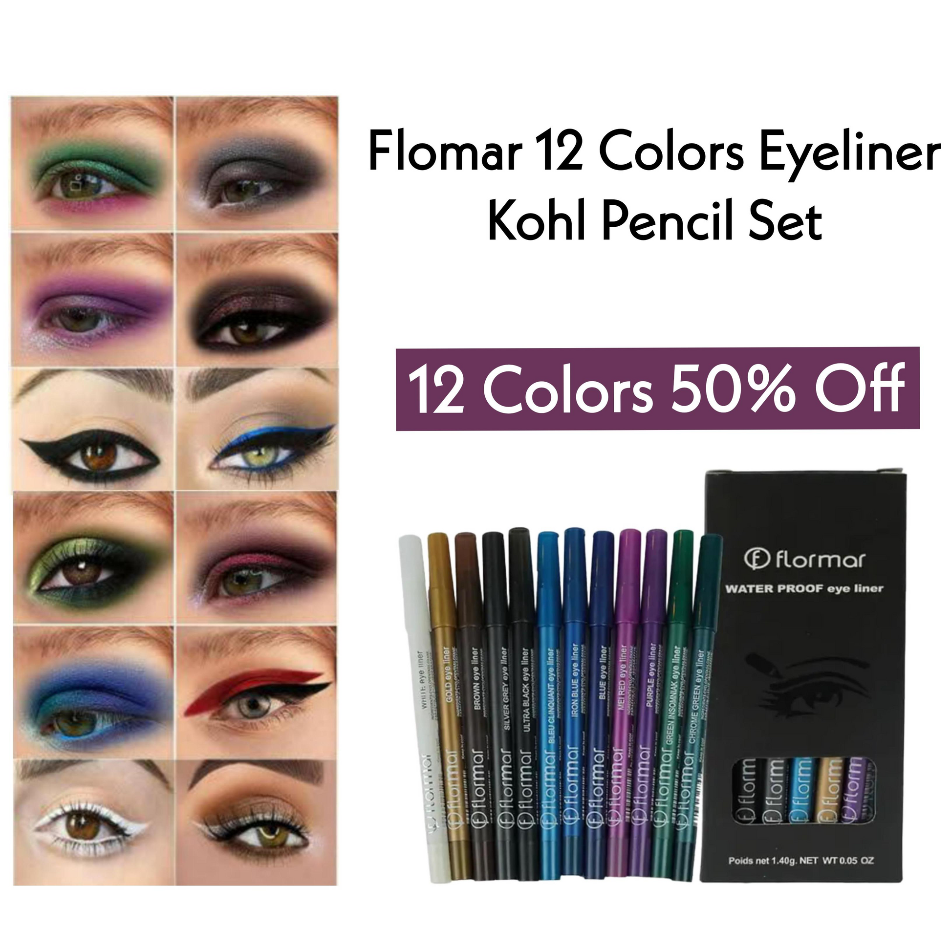 Unlock your inner artist and transform your eye makeup game with the Flomar 12 Colors Eyeliner Kohl Pencil Set. Make every look a masterpiece—purchase yours today!